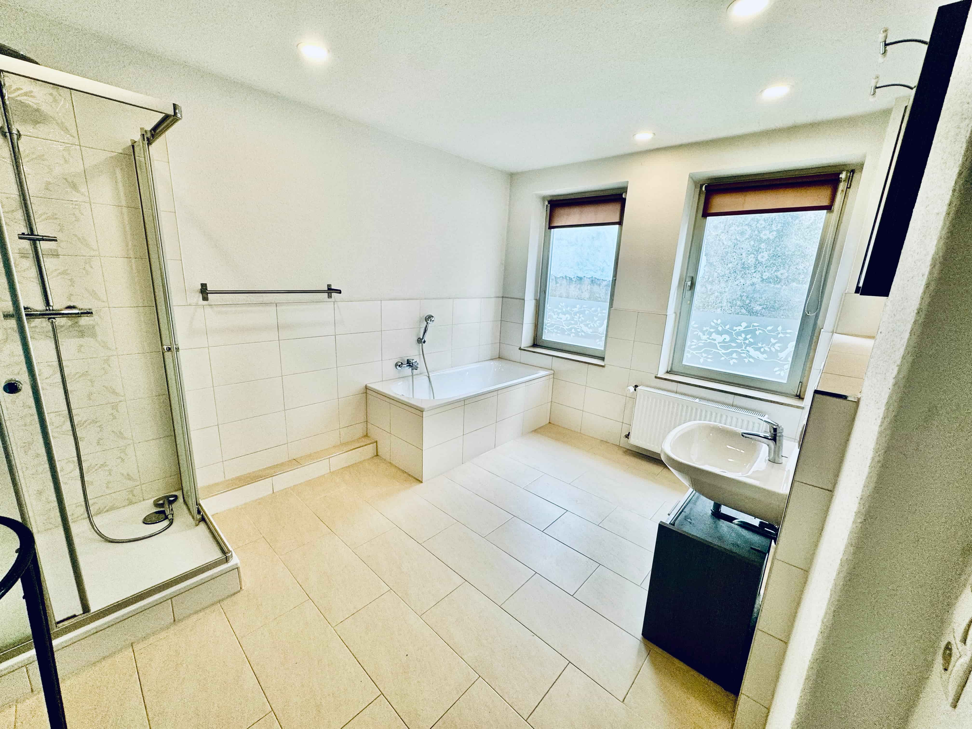 Im Obergeschoss stehen drei weitere Zimmer zur Verfügung, in einem davon ist eine zusätzliche Einbauküche integriert. Ergänzt wird diese Ebene durch ein Badezimmer mit Badewanne.