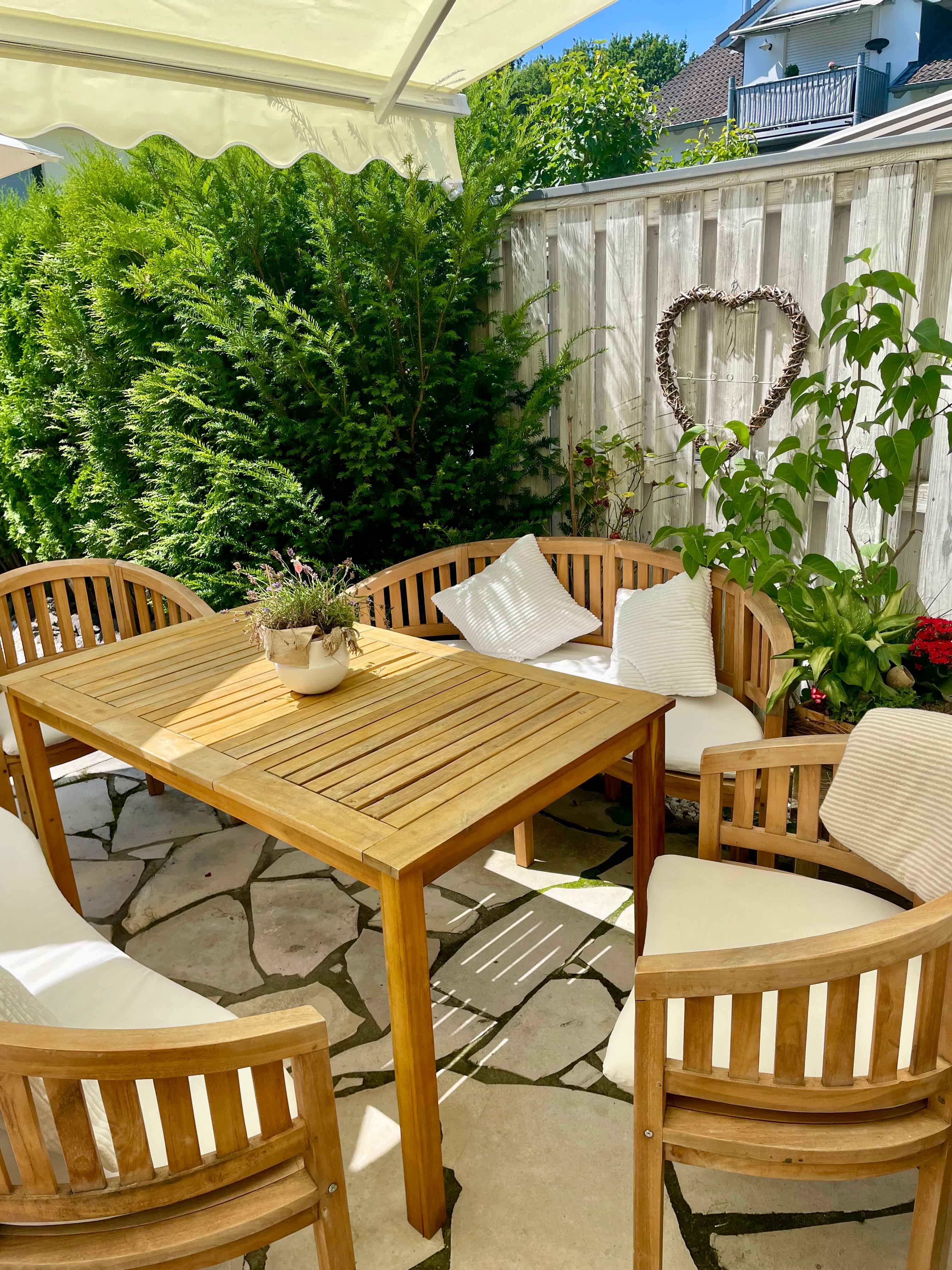 Der helle Wohn- und Essbereich bildet das Zentrum des Hauses und schafft eine harmonische Verbindung zum mediterran angelegten Garten. Mehrere Sitzbereiche und die gewachsene Bepflanzung verleihen dem Außenbereich eine besondere Atmosphäre.