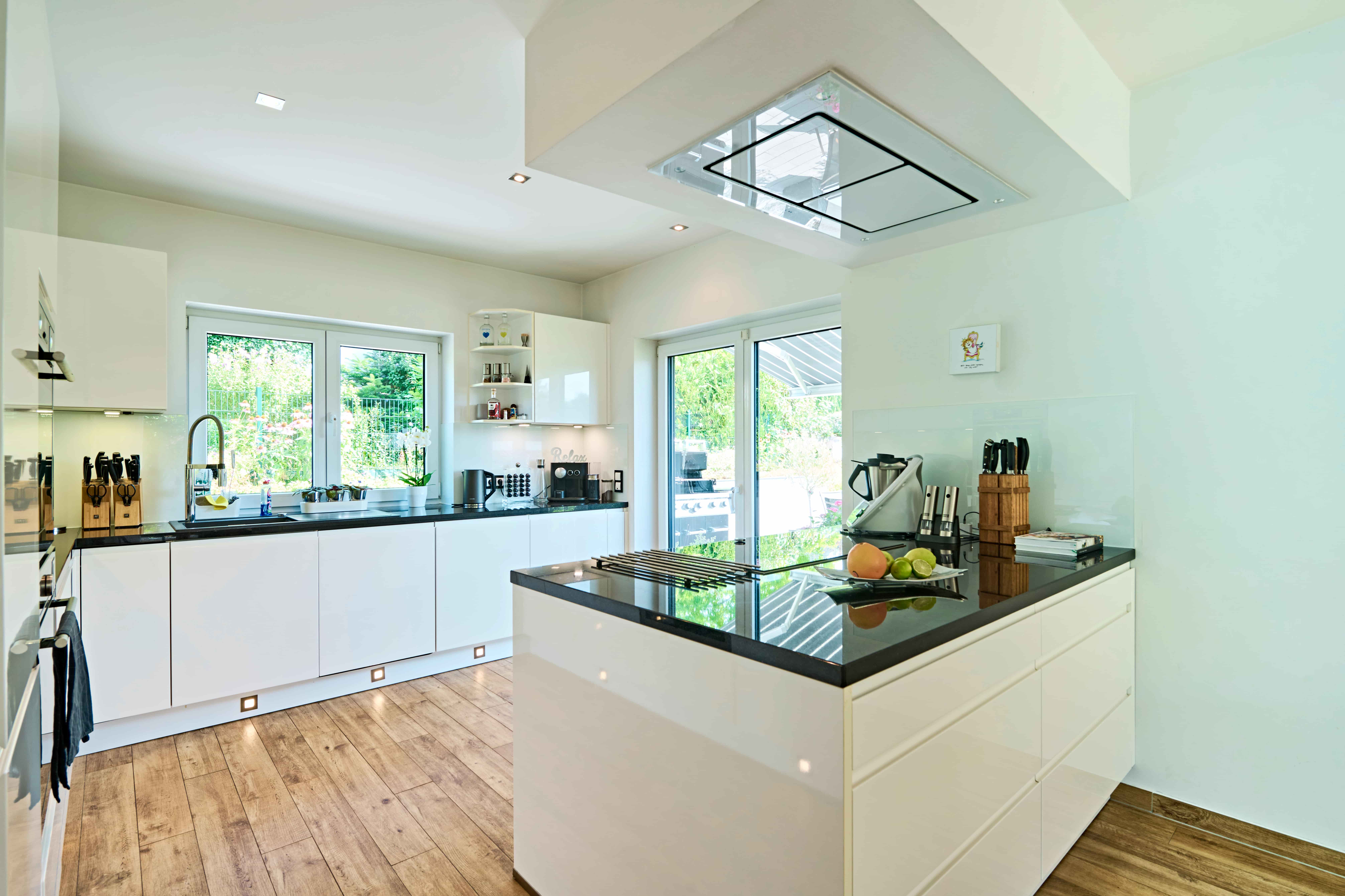 Die offen integrierte Küche ist funktional geplant. Die Kochinsel dient als Treffpunkt im Alltag ebenso wie bei Besuch. Kurze Wege und großzügige Arbeitsflächen gewährleisten eine hohe Alltagstauglichkeit.
